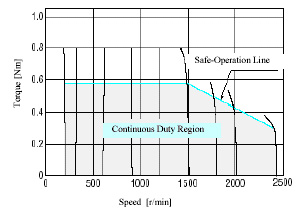 The Rotational Speed-Torque characteristics of the inverter unit are shown Fig. 26 and Fig. 27. As explained in the AC speed control motor section, a "Safe-operation line" is drawn on the torque characteristic. This line represents the limit for the continuous operation, and the area under this line is called the continuous operation area.